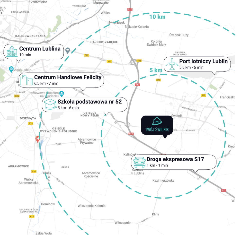 Twój Świdnik to idealna propozycja dla tych, którzy szukają spokojnego miejsca dla swojej rodziny, ale chcą też mieć wygodny dostęp do pełnej infrastruktury Lublina. Do centrum miasta samochodem dotrzesz w ok. 10 min. Najbliższy przystanek, z którego odjeżdża autobus do Lublina jest w odległości 200 m od inwestycji. Na wyciągnięcie ręki znajdziesz tu również niezbędną infrastrukturę: sklepy, szkoły, punkty usługowe, centrum handlowe czy siłownię.